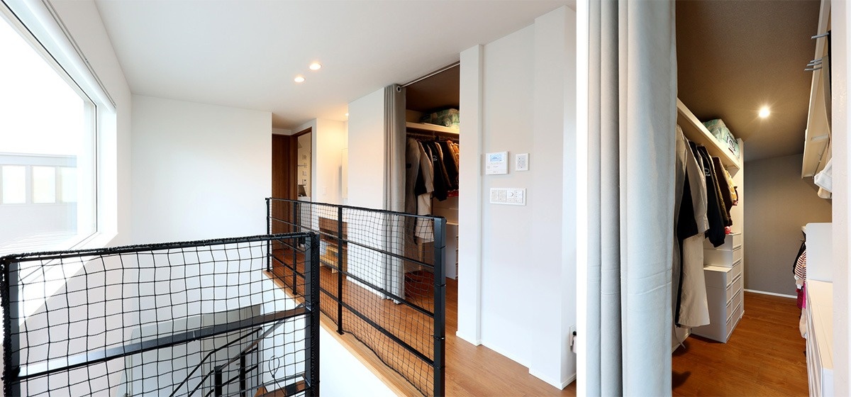 1階リビングにお子さんのプレイスペースを追加した結果、その屋根部分を使用して2階寝室にテラスを付けることにました。軒下にかけた洗濯物は、そのままウォークインクローゼットに収納できます。奥行きのあるウォークインクローゼットは、収納量抜群です。