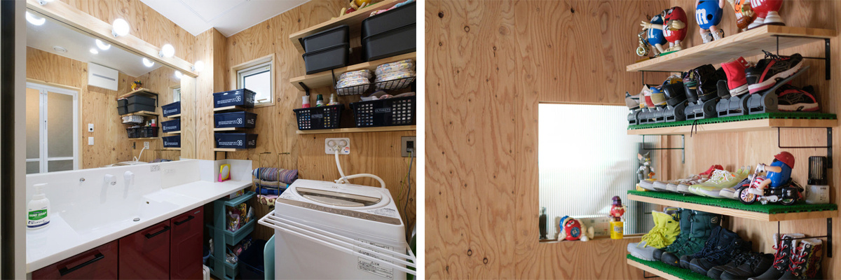 洗面スペースには実際に住んでみて奥様が必要と思ったところに棚を設置。下地補強なしで自由に棚を造れるのも構造用合板表しのメリットです。釘の跡も目立ちません。