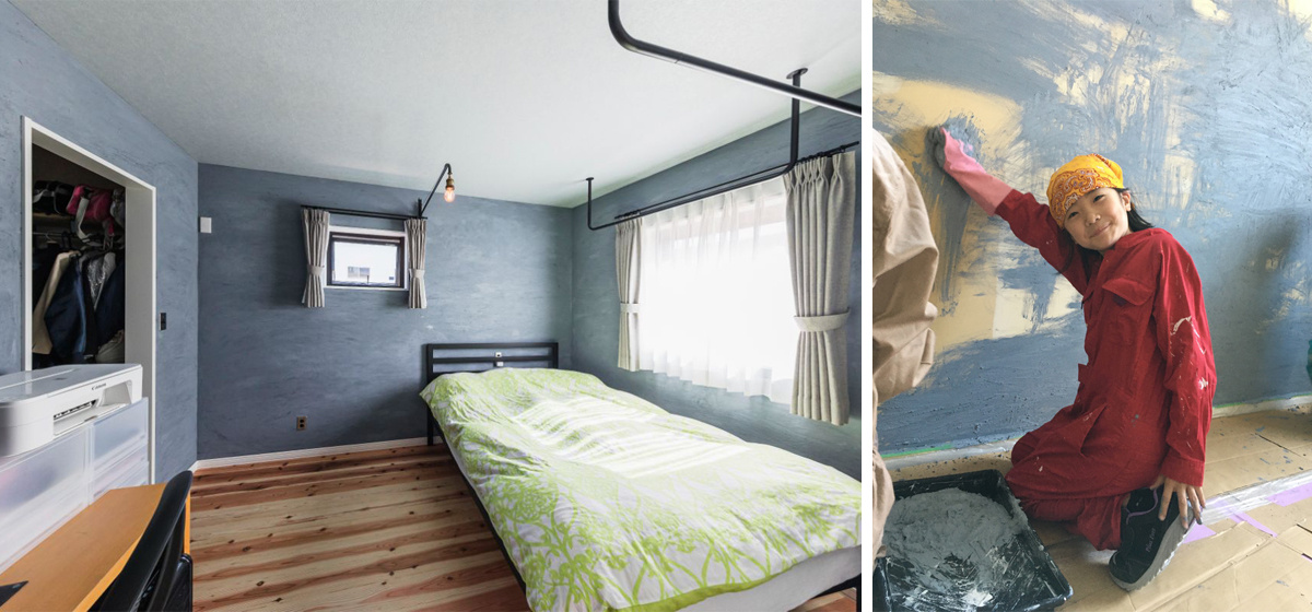ホームセンターに勤めていた経験のあるというご主人は道具や素材に関する知識も豊富。こちらの寝室の壁は「モルモル」という手で塗れる塗料を使い、家族全員で仕上げました。ウォークインクローゼットの棚も、ホームセンターで金具を購入してDIY。