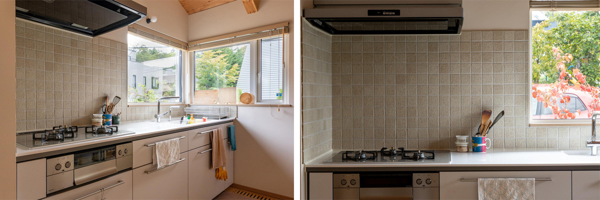 キッチンにはコーナー窓を採用、庭や周囲の緑景を眺めながら家事ができます。壁面のタイル貼りは、Yさん自ら担当しました。「コスト削減につながっただけでなく、自分たちも家づくりに参加したことで愛着も増しましたね」とYさん。