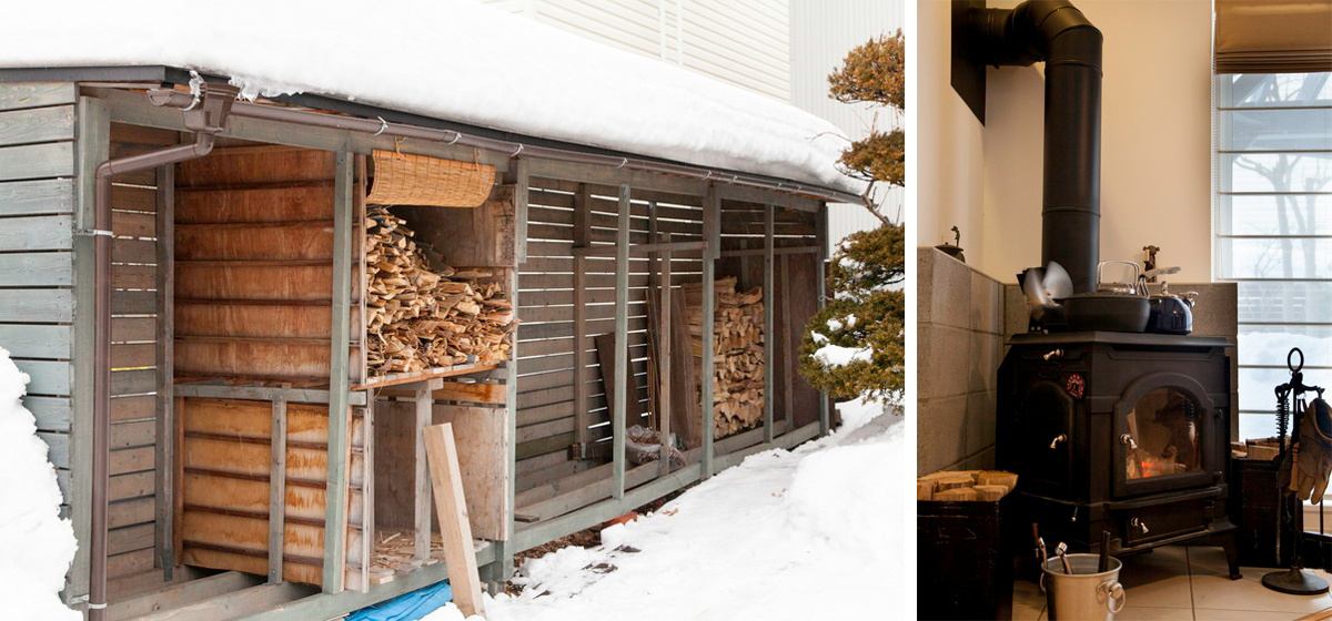 「薪のストックの仕方がきれいですよね」と辻野社長。庭の一面いっぱいに配置した薪小屋はご主人のDIYによる力作です。