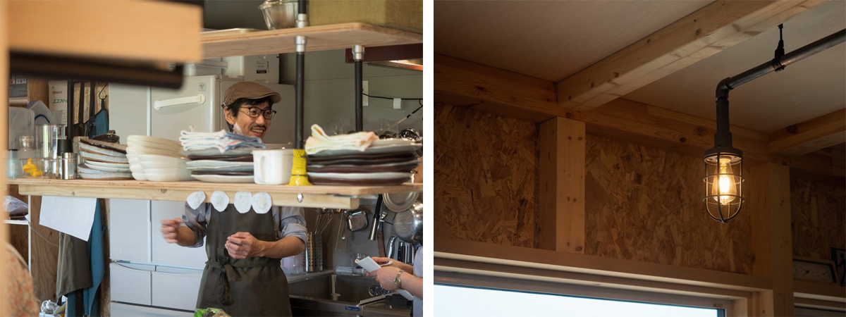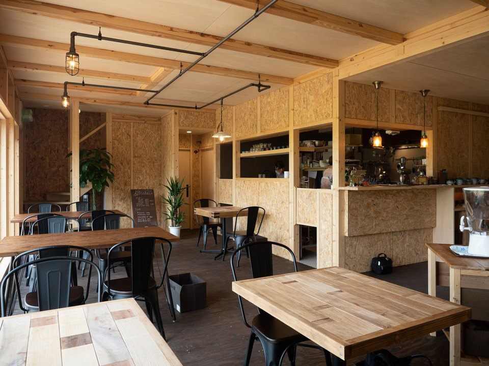 Sさんご夫婦は、OSBの表面をサンダー掛けしてきれいに仕上げました。さらに店内にはご主人がDIYで作ったテーブルやカウンター、照明などがさり気なく使われています。