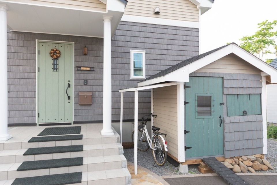 玄関の横に、外装のデザインと統一感のある物置があります。実はご主人の手作りです。