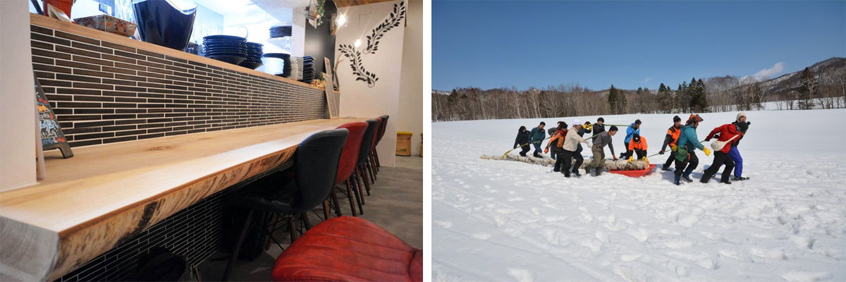 このお店の自慢の一つ。5.5メートルの大きなカウンターテーブルは北海道民おなじみの木「白樺」をきこり、家具職人、建築家、林業研究者、地元の生産者、学生、地域おこし協力隊員などたくさんの人の力を借りて江丹別の山から伐り出し作成しました。