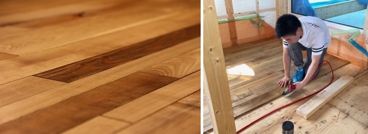 キハダの床材を塗装・真夏の現場で一緒にフロア貼り 当別町T邸/辻野建設工業