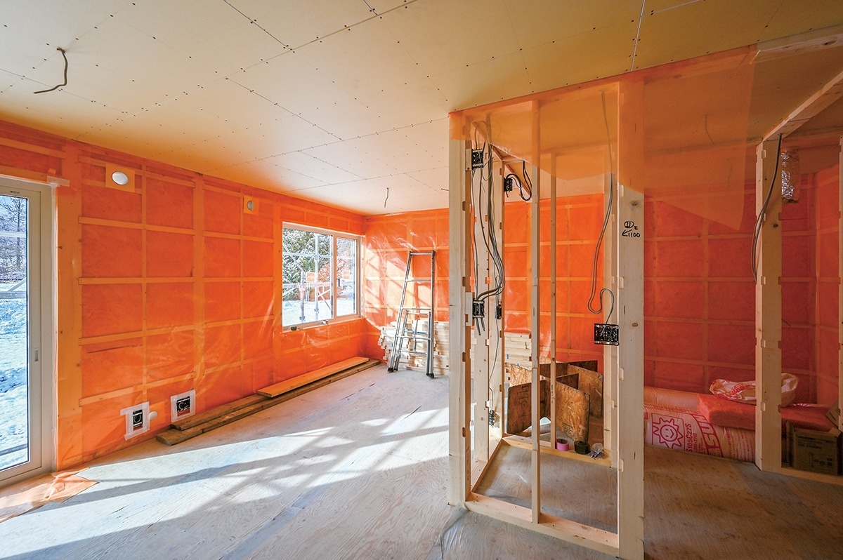 断熱・気密施工まで終了した木造仮設の内部(2DKタイプ)。