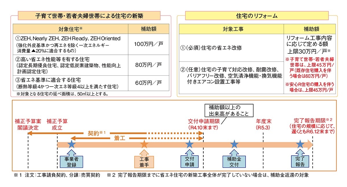 対象となるのは、契約・着工ともに今年11月26日から来年10月31日までに行う注文住宅の新築および新築分譲住宅の購入と、同期間内に契約し工事が完了するリフォームで、このうち注文住宅の新築と新築分譲住宅の購入は、18歳未満の子供がいる世帯または夫婦のいずれかが39才以下であることが必要。リフォームはすべての世帯が対象だが、子育て・若者夫婦世帯は補助額の上限を引き上げる。