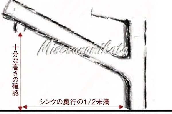 また、お客様からは、デザイン性に気を取られ、シンク面と吐水口までの高さが十分取れていないケースで「水筒やペットボトルなど筒状のものを洗う時に、洗い物を横にしたり斜めにしないと、中まですすぐ作業がちょっと不便」というお声を頂いたことも。これは水栓の立ち上げ位置も大きく関係します。