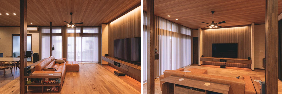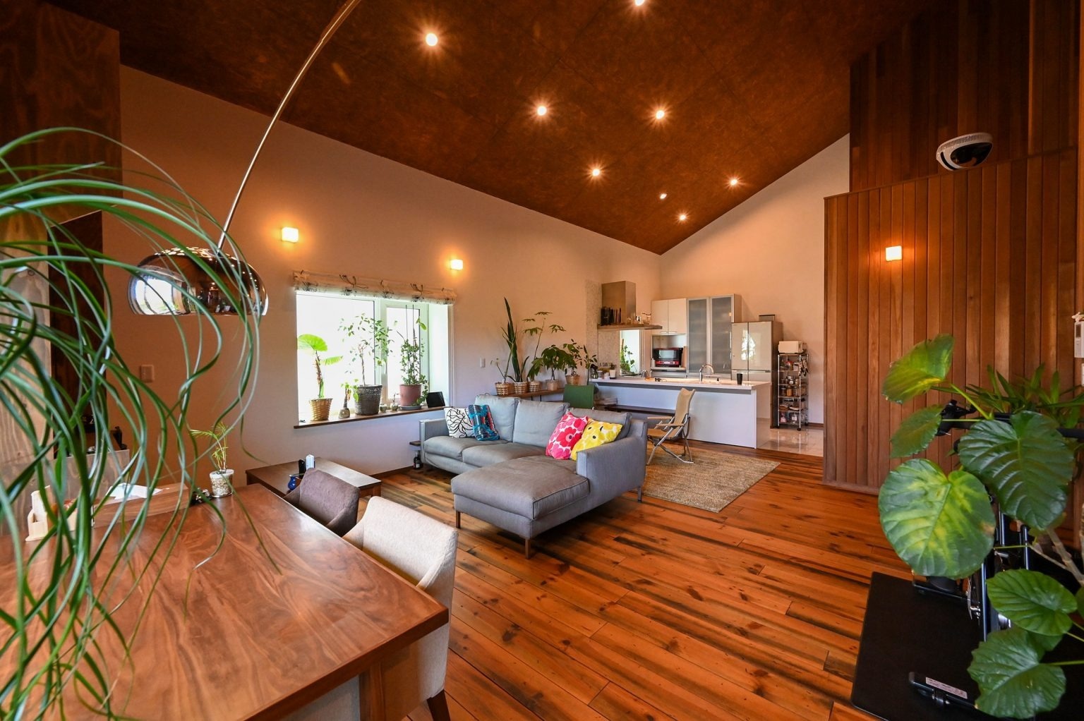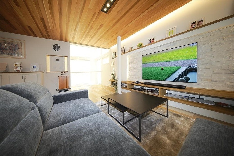 リビングでまず目を引くのは天井。レッドシダーの板張りを色の濃淡を活かし、大工さんが色のバランスに配慮しながらランダムに貼ることで、天井の高さやリビングの奥行、空間的な広がりが引き立ちました。壁際には間接照明も配置、モダンな印象も加わりました。