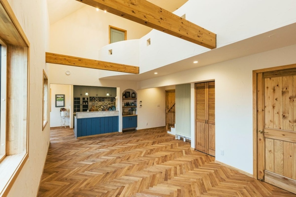 リビングルームは広々とした吹き抜け空間にしました。ヘリンボーン柄に貼ったナラ材の床はご主人のお気に入りです。