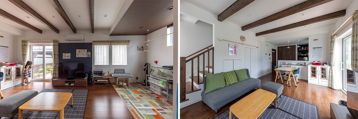 打ち合わせを重ねながら、LDKに子どもの遊べるスペースと大きな収納を追加しました。ソファー背面の階段下も、収納として活用。