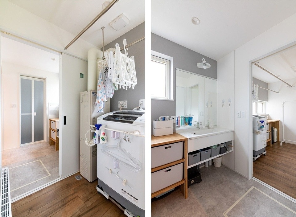 奥さま 私が子どもの頃は、洗面所や脱衣室を使っている時に家族が出入りするのが落ち着かなかった記憶があり、この家は各スペースを独立した造りにしていただきました。ボイラーがある部屋をランドリールームにする案は、担当の入山さんからのご提案でした。家族の洗い物が多いので、洗濯物が乾きやすいのはうれしいですね。