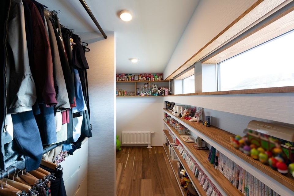 ママ専用のクローゼットも作りました。主寝室と引戸でつながる奥さまのクローゼットは、ハンガーラックのほか、奥まで壁一面に趣味のコミック本や雑貨などが収納できるニッチ棚を造作しました。奥行きのある窓台を造ることから専属大工が手づくりで行っており、キクザワの提案力と職人の技が光るポイントです。