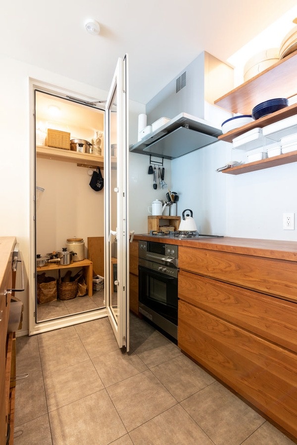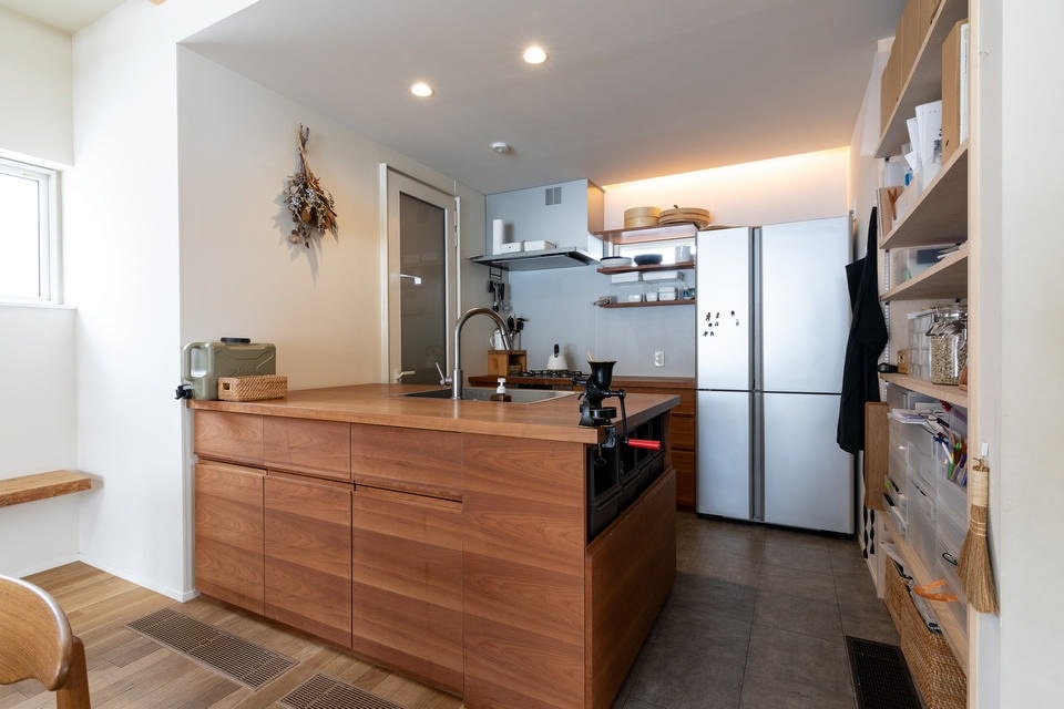 メインのキッチンカウンターはシンクを、壁側のカウンターにはコンロを付けたセパレートタイプ。旅する木で棚も造作しています。普段からパンはグリルで焼き、ご飯はお鍋で炊くため、家電製品はほとんどありません。カウンターのわきには、外気導入式の大型食料庫(パントリー)を備えました。