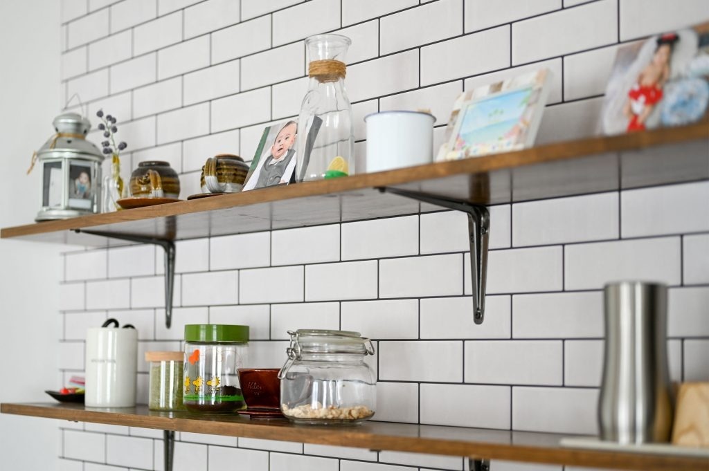 ・コレクションした食器類を飾って楽しめるキッチンの壁掛けシェルフ