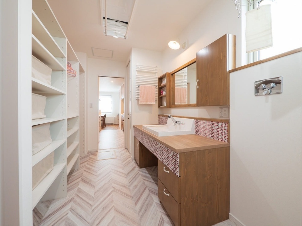 家族が2階で過ごすことが多いことから「動線を短くしたい」との奥さまの希望で、キッチンの正面にメインの洗面所を設けました。家族が並んで支度ができるようカウンターはワイドタイプ。通路も広めです。