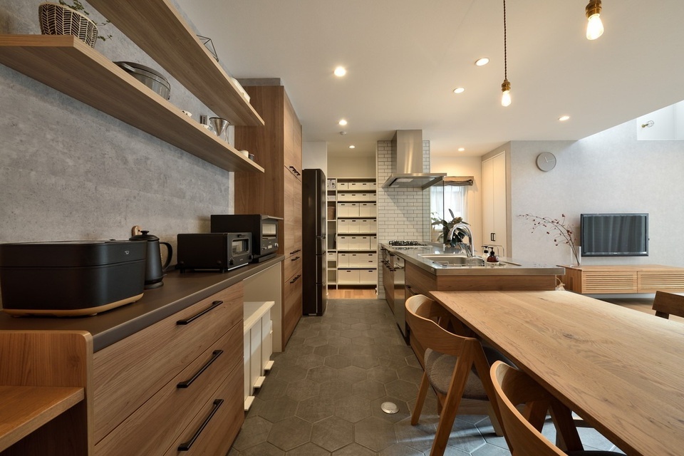 背面にはコンクリート柄の壁紙をチョイス。木目調の収納やフラットシェルフが映える奥さまお気に入りのポイントです。キッチンには奥さまの希望でドイツ・ミーレ社の食洗機を装備しています。レンジ奥には便利なパントリーも。