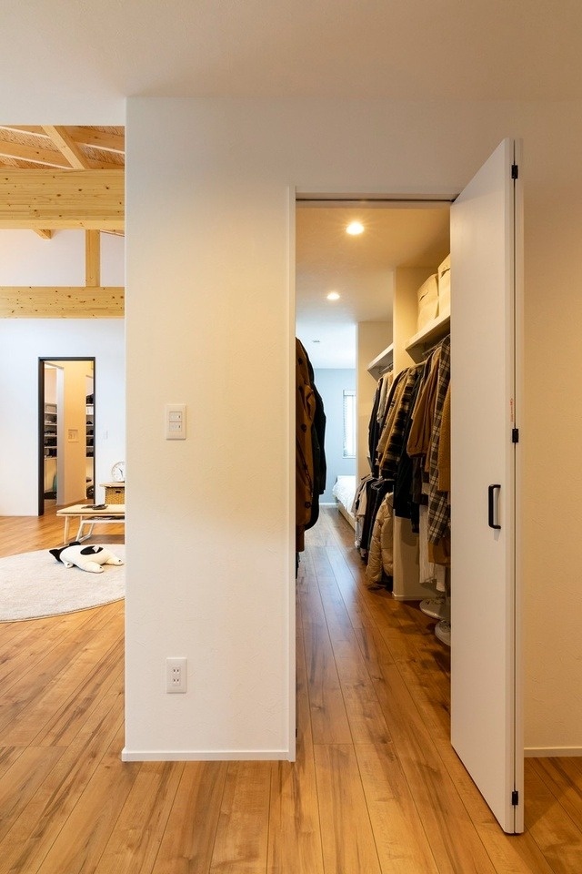 夫婦の寝室につながるウォークスルークローゼットは、ぐるっとまわってリビングにも出られる回遊式。通路と収納を兼用し、空間を有効に活用しています。
