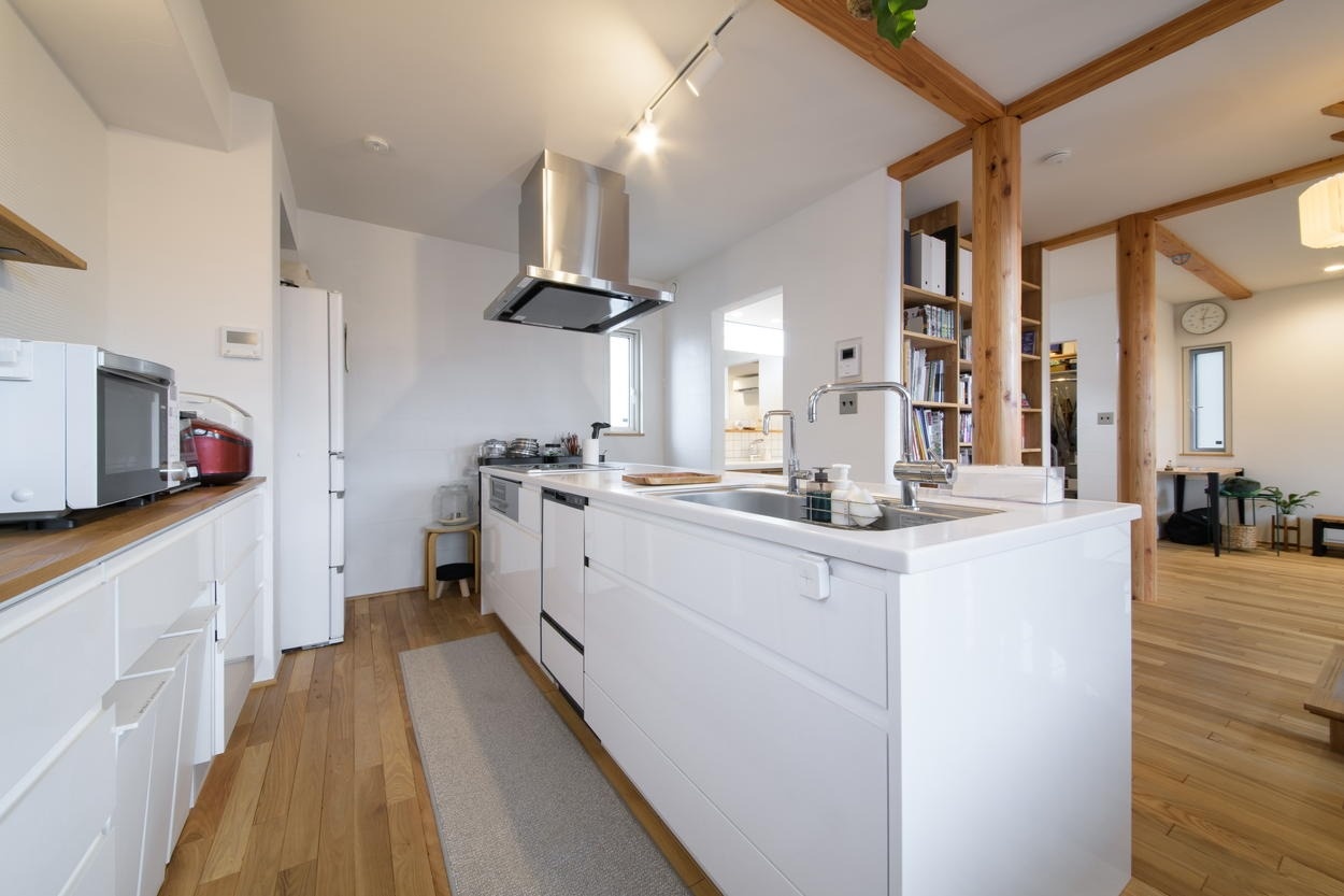 奥様がご希望のオープンキッチンはゆとりの広さで料理がしやすく、リビングのお子さんたちの様子もよくわかります。