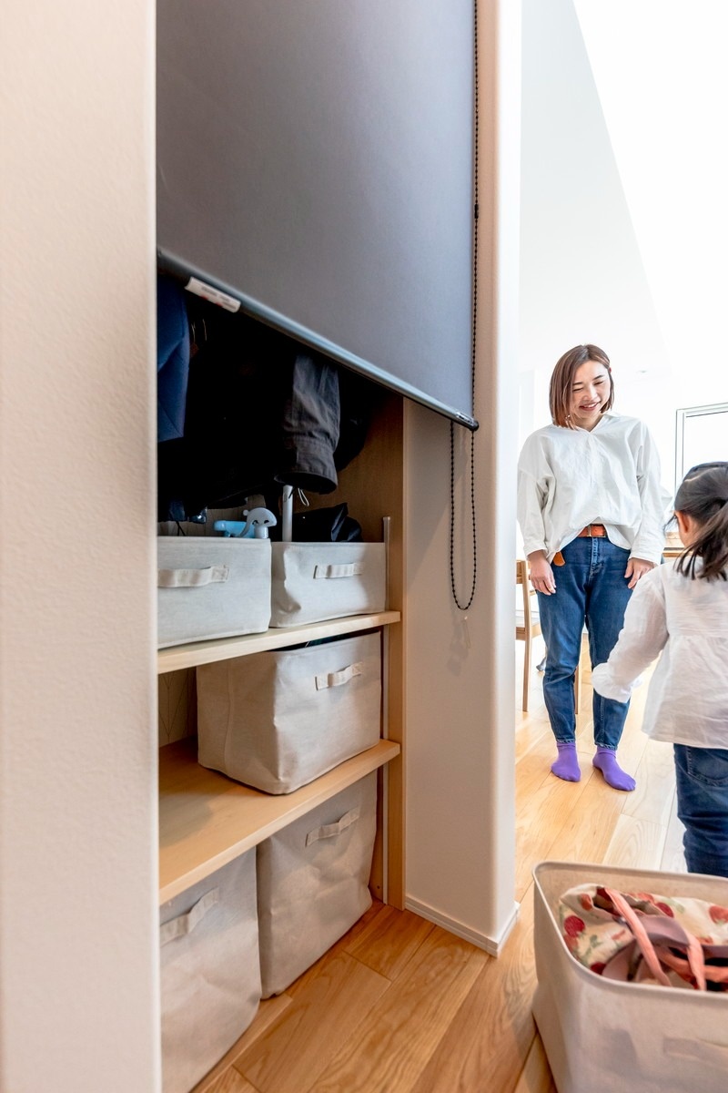 玄関とLDKの間にある収納は、帰宅時に子どもたちが、かばんや上着を片付けるスペースになっています。マイBOXに自分の物をしまう仕組みなので、片付けの習慣も身に付きそうです。出し入れしやすいように、ロールスクリーンを採用しました。