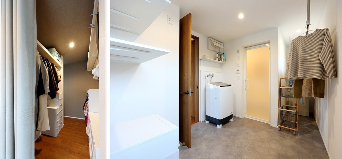 右・クローゼットの出口から見たユーティリティ。物干しスペースも付けた、ゆったりとした空間です。家事のしやすさを考え、奥さまが最もこだわったポイントです。洗濯機の横にあるドアからホールに出入りできる回遊式です。