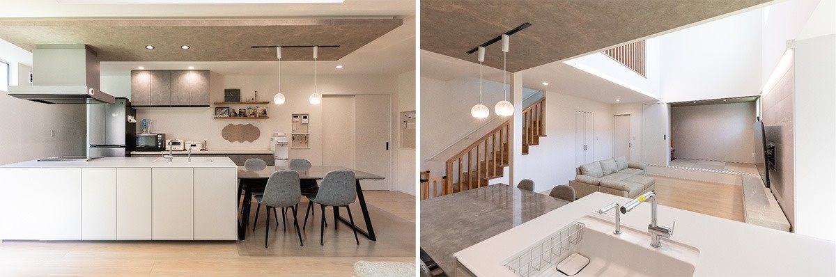 「どこにいても家族の様子を見守ることができる家にしたかった」という奥さま。キッチンからはリビング全体を見渡すことができ、吹き抜けを介して2階にいる家族ともコミュニケーションが取りやすい造りです。