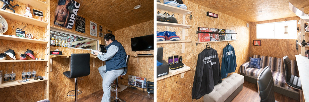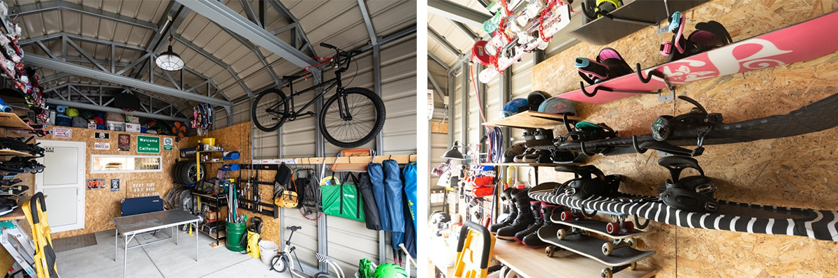 ■スノーボードやスケートボードを飾って眺められるガレージ