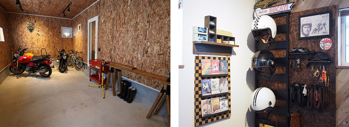 ガレージ内部に、木造で小屋を作ったのです。好きなスポーツのグッズなども並ぶお気に入りの空間です。ご主人は、以前は住宅や一般建築の断熱工事を行う職人さん。今は各家庭のハウスクリーニングや水回りメンテナンス、庭の手入れ、引っ越しサポート、害虫駆除など、住まいの困り事を解決する会社で店長をされています。仕事でも趣味でも、ものづくりや整備が好きで、このガレージは、それを満喫できる空間なのです。