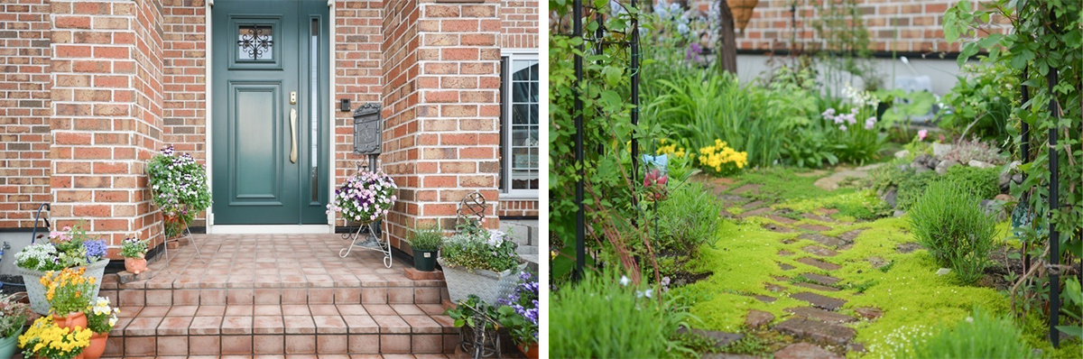植栽、レンガの外壁、玄関ドアの色合いが美しいT邸。レンガを敷いた隙間にふわふわした繊細な印象の緑のモスが広がっていました。雑草を抑制する、土が剥き出しになるのを防ぐ役割もあります。