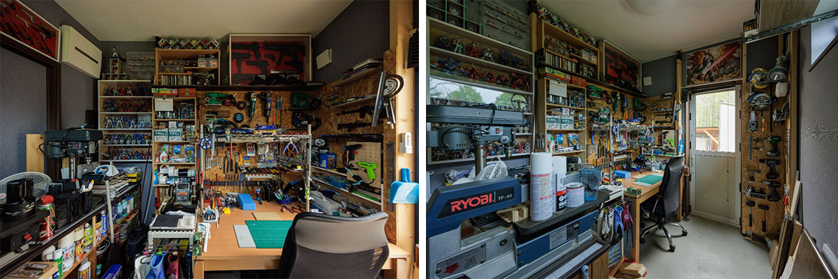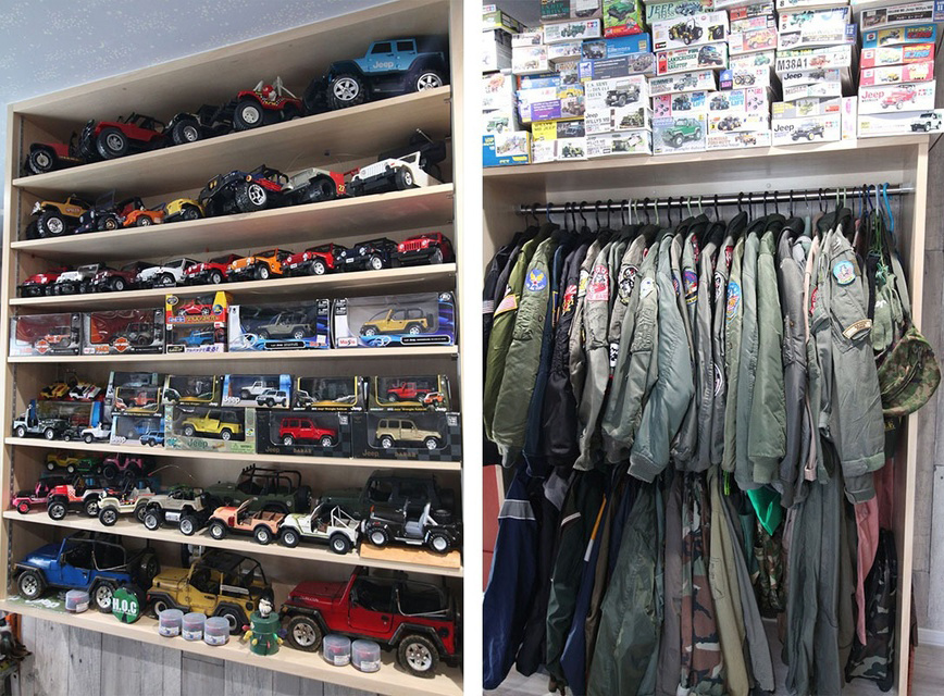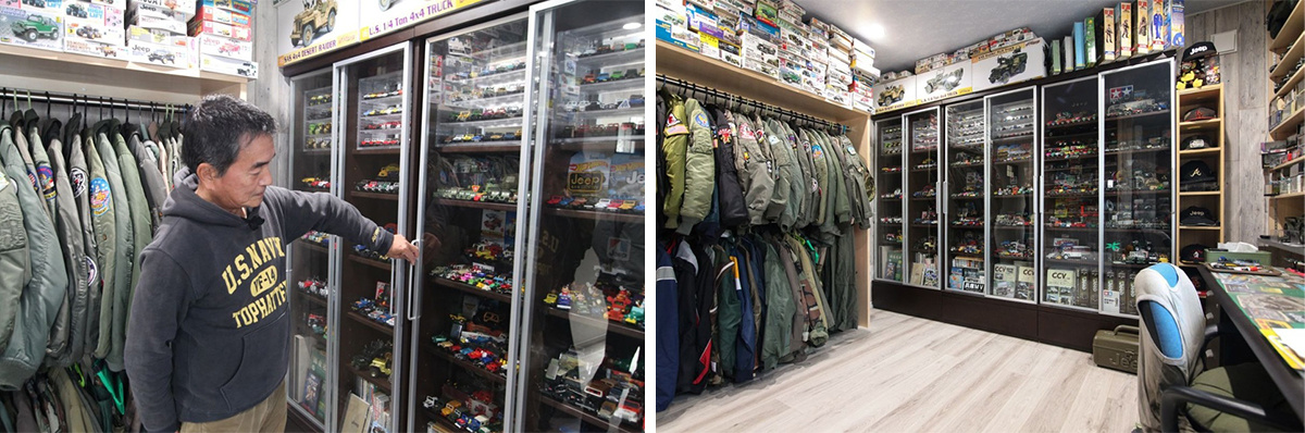 花岡さん 私の要望で作ってもらった趣味の部屋です。ジーブのミニカーだけで約1000個くらいあります。MA-1(アメリカ空軍のジャケット)収集も趣味ですし、まだ作っていない、いつか作る予定のプラモデルもたくさんあります。およそ35年近くかけてコレクションしたお宝を、趣味の部屋に陳列することで、好きな時に眺められるようになったのはとても嬉しいですね。