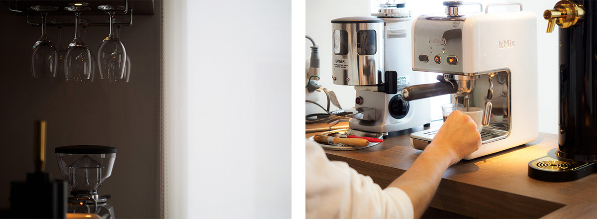 写真の左端にあるのは、豆の風味を逃がさないコーン式のグラインダー(電動式のコーヒーミル)。真ん中にあるのが、イタリアのデ・ロンギ社製エスプレッソマシン。デザインもさすがおしゃれです。 Kさんは、グラインダーを使った挽き立てのブレンド豆でエスプレッソを2ショット抽出。ちなみに、右にある黒い機械は、ビアサーバー。きれいな泡で飲めそうですね。うらやましい。