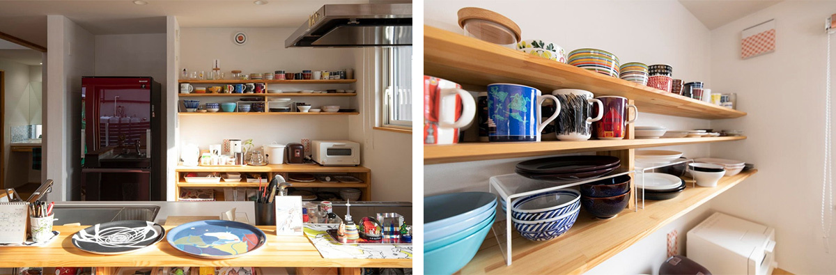 キッチンの収納は扉をつけず「見せる収納」を徹底。どこに何があるのか、一目で分かるようになっています。