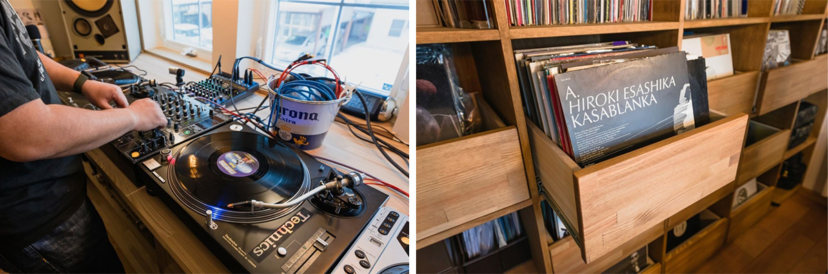 レコードを収納する棚はもちろん造作。レコード店などで見るような引き出し型で、収納とディスプレイを兼ねています。