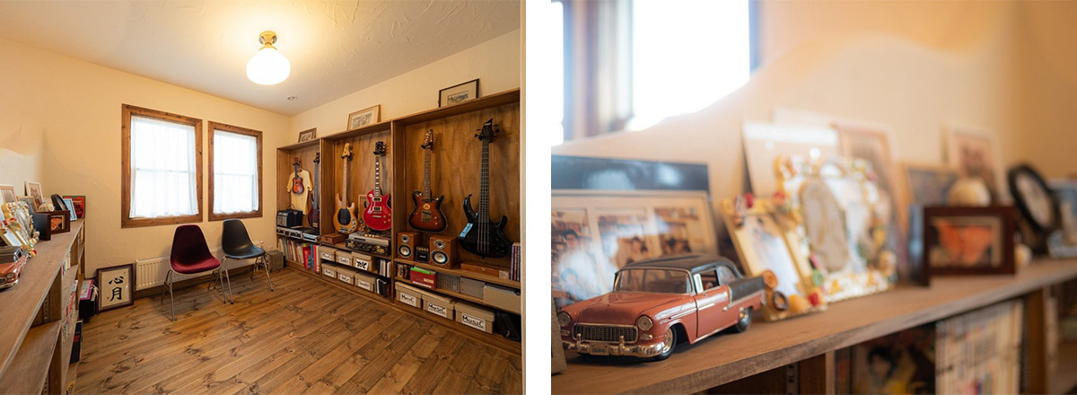 趣味のギターやベースと思い出の品をディスプレイして楽しむ暮らし 帯広市/cubeチセ