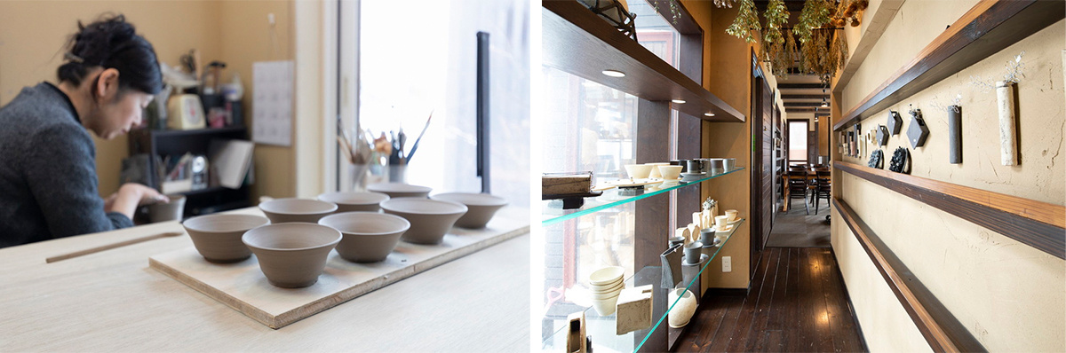 通路を右に曲がった先に、陶芸用のアトリエがあります。「ここで過ごす時間がとても好きです」と奥さま。大きな開口部からやさしい光を受けながら、創作の時間が流れます。