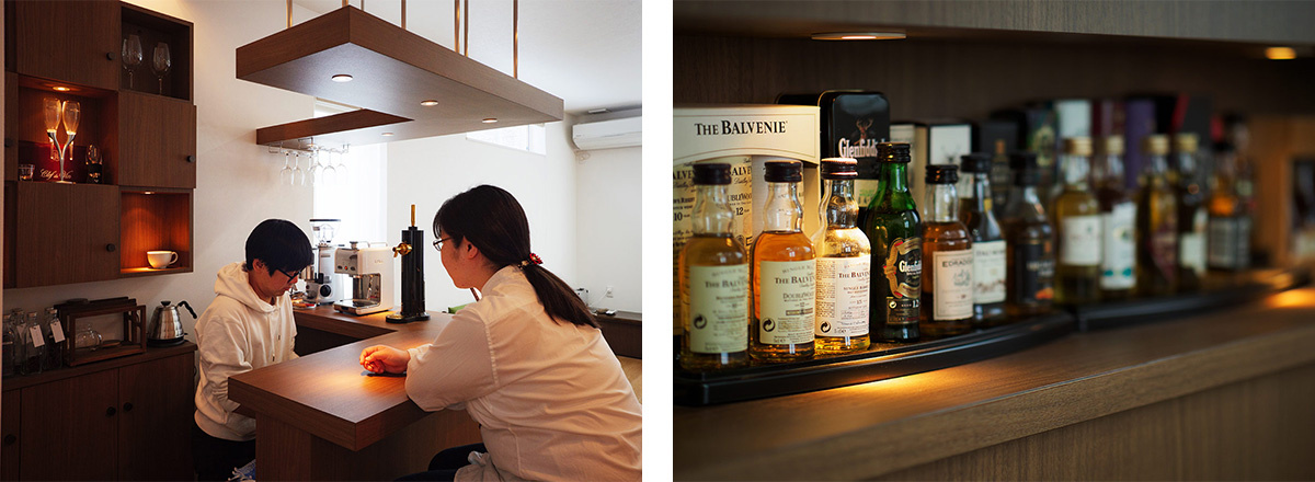 Kさんは、カフェや喫茶店をはしごして研究したぐらいのコーヒー好き。 このカフェカウンターを作ることは、家を建てるときに外せない条件でした。ウイスキーの小瓶もいっぱい並んでいて、まるでバルのカウンターのよう。