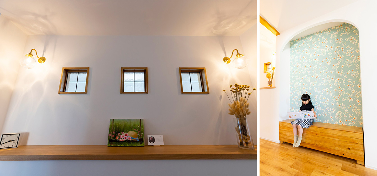 画像右はアーチ状の下がり壁とアクセントクロスでひと際映えるヌック風スペース。DIYが好きなご主人がお手製の収納ベンチを作ったので、ゆったりくつろげる場所になりました。