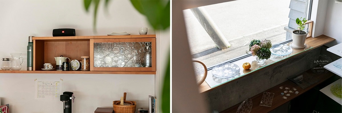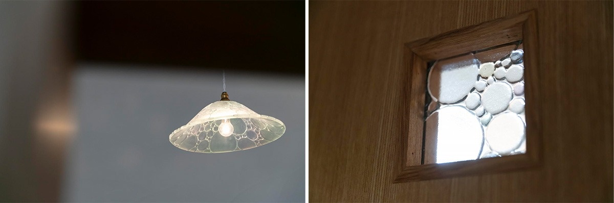 ペンダントライトも、トイレのドア窓も、キッチンの壁面収納も、さりげなく使われているのは奥様の絵里子さんの手によるガラス作品。板ガラスをカットして焼き合わせるフュージングという技法でつくられた作品が、光を美しく装飾しています。