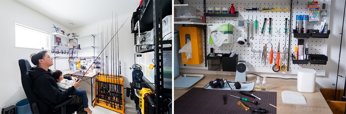 パンチングボードの壁面収納には、釣り糸を巻き取るリールや、修理・オーバーホールをするための工具が美しく並びます。