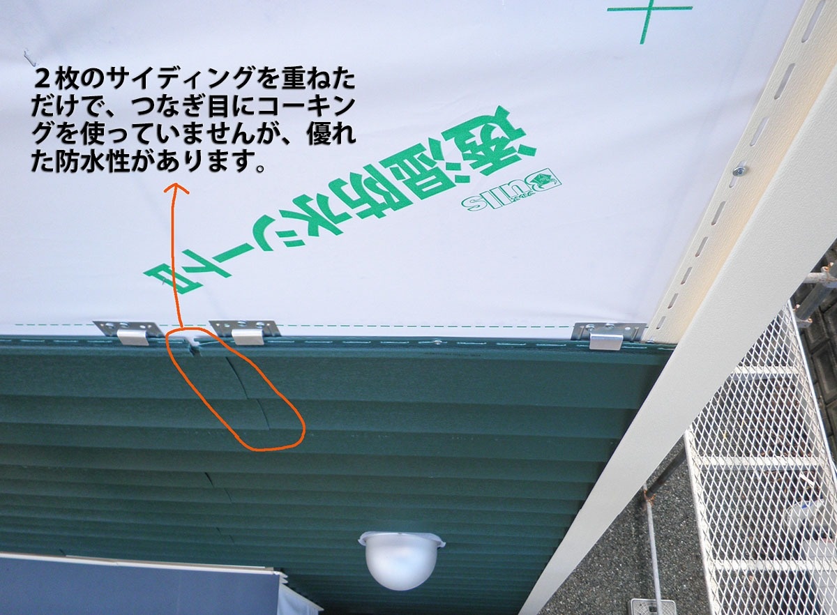 施工中のサイディングを上から撮った写真。サイディングの端部同士を重ねて接合している