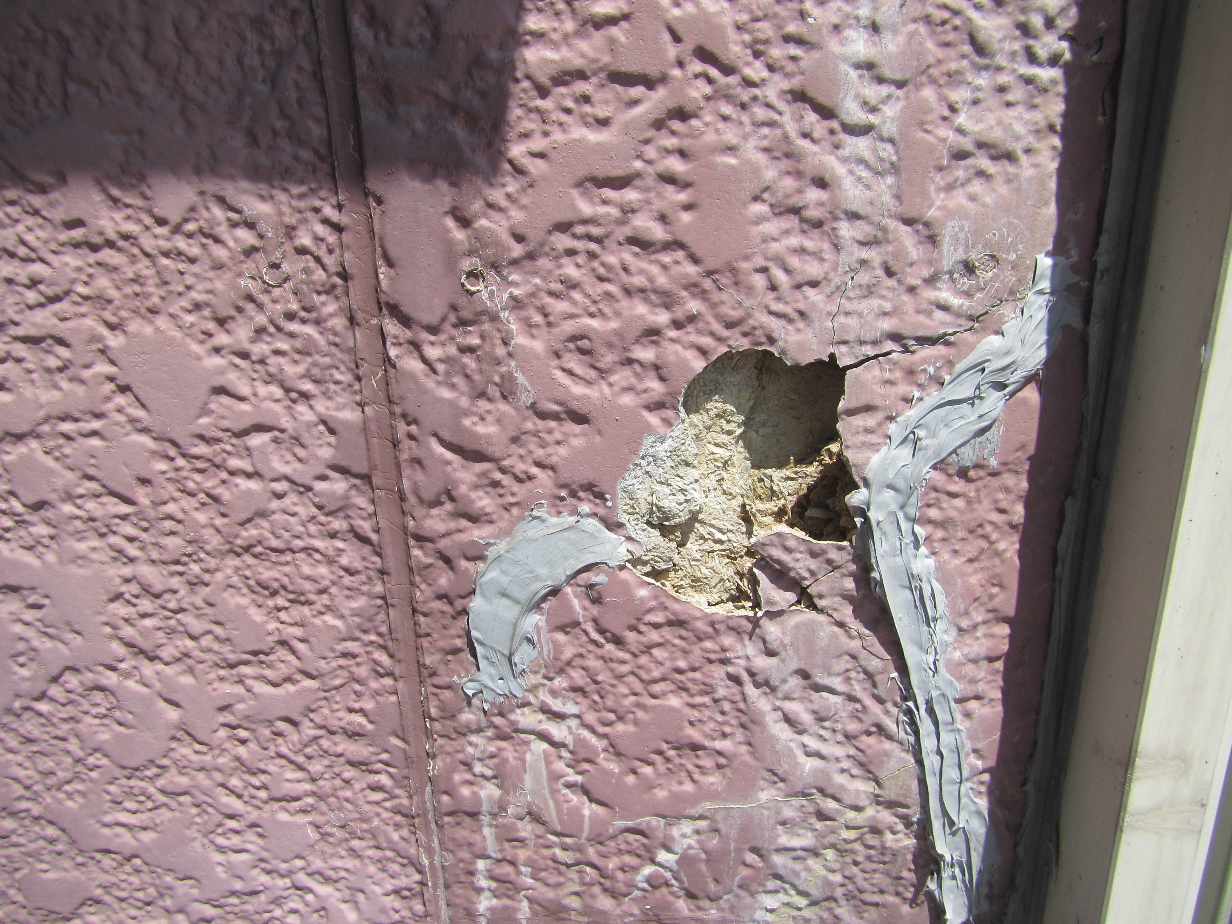 穴が空いている外壁材。カバー工法を行う際は、住宅の寿命を延ばすためにも補修が欠かせない