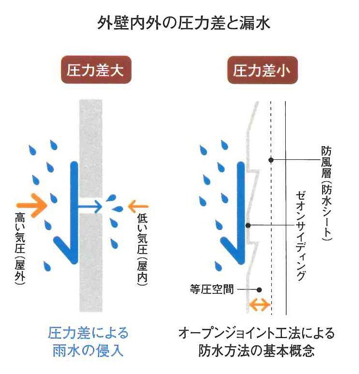 シーリングが劣化してひび割れ等ができた場合、気圧の高い外壁の屋外側から気圧の低い外壁の内側に雨水が浸入しやすくなります。継ぎ目を開放しているオープンジョイント工法は、サイディングの内外で気圧差が生じないため、外壁の室内側に雨水が浸入しにくい仕組みになっています。この仕組みは研究機関との共同研究によって実証されています。