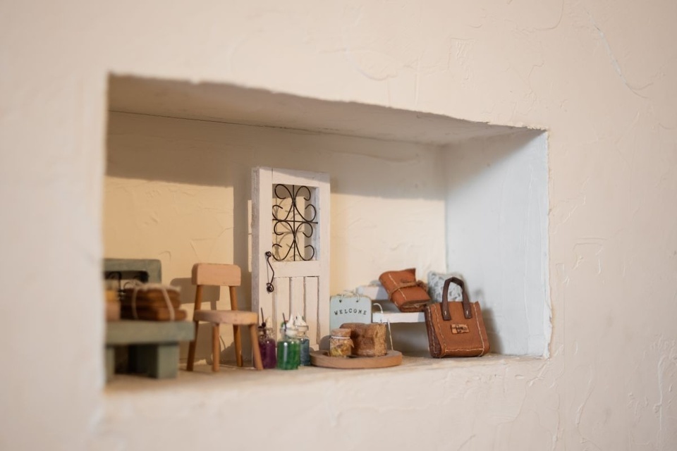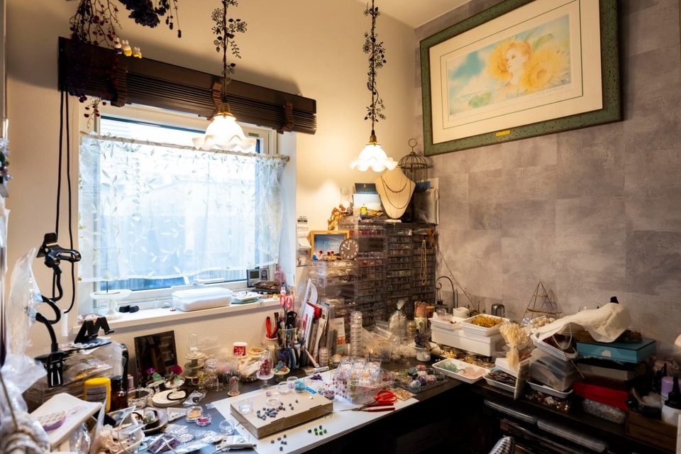 「トイレくらいの大きさでいいから、工房がほしい」と頼んでつくってもらったアトリエは、1階リビングのテレビボードの奥にあります。「ちょうど作業中で片付いていませんが」と、中をのぞかせてくれましたが、2.5帖の工房には、天然石やビーズ、金具など、小さなパーツがぎっしり。