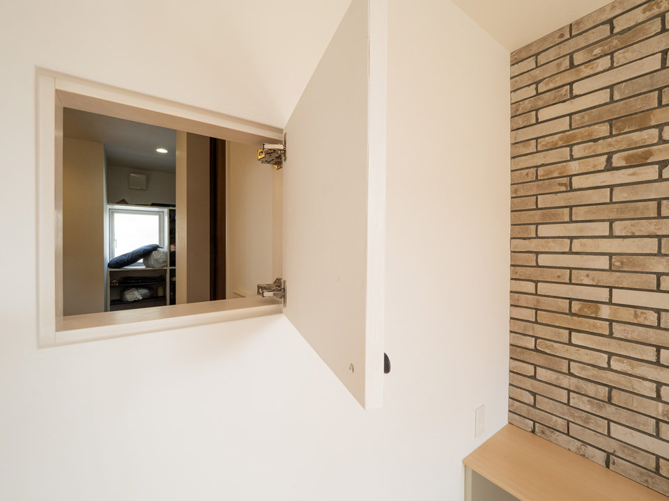 壁に設けられた小さな開口部は、玄関へ行かずに受け取り口の郵便物を取り出せるもの。「主人が朝出かけるときに、ここから『いってらっしゃ~い』と言ったりするんですよ」と奥さま。