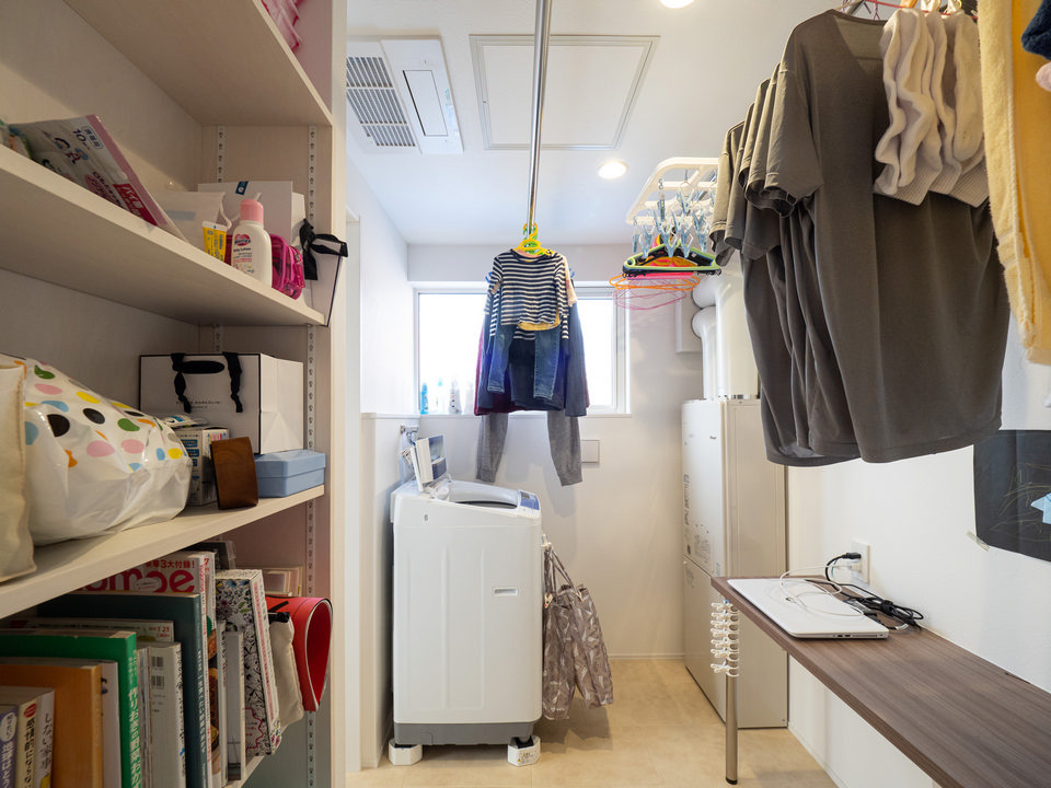 キッチンに隣接した家事室は奥さまのお気に入りです。「前の家では、1階で洗濯したものを2階へ行って干すのがすごく面倒でした。設計の方に話したら、ここだけですべての洗濯作業ができる部屋を造ってくれたんです」。家事の合間にパソコンなどができる、奥さま専用のカウンターも設けました。