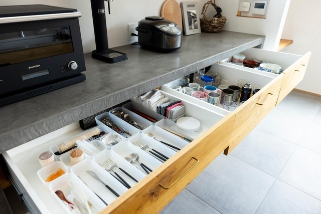 背面収納には食器や調理器具が使いやすよう引き出し内部にきれいに整頓されています。冷蔵庫の横には、保冷庫を完備。断熱材で区切った庫内に外気を取り入れ、冬は冷蔵庫並みの低温を保持します。くだものなど主に食料品をストックするのに適してます。