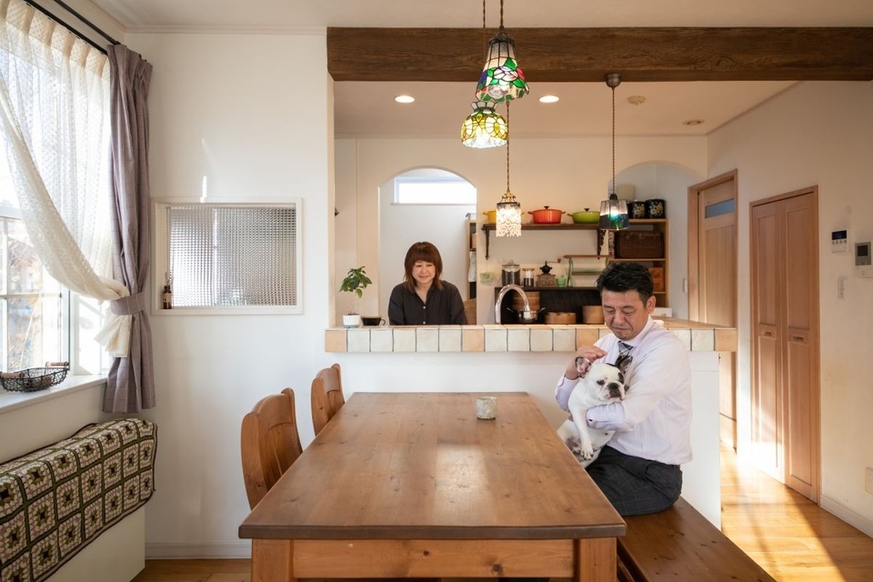 奥さま 12年前のことですが、雑誌などをいろいろ見て好きなデザインを探しました。夫に見せて相談しながら一つずつ形にしてもらう感じでした。アンティークの家具も好きで、そういったアイテムが似合う感じにしました。着工後も含めてほぼ毎日打ち合わせをしました。素材や間取りを考えるのも楽しかったんです。収納は十分あって大変便利です。家の暖かさも十分。いろんな要望を叶えてくれたので12年住んだ今でも良い家ができてよかったという気持ちです。