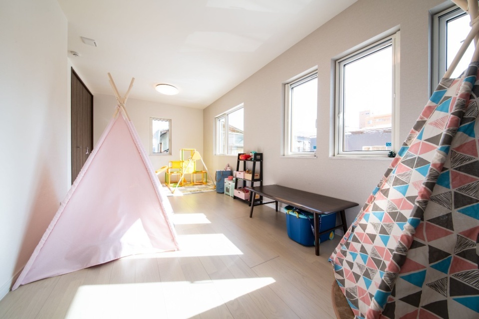 2階子ども部屋は2つの個室に分けられるようにしていますが、今は広々と遊べるスペースとしてオープンに使用。なるべく明るい家にしたいという要望で、子ども部屋にも窓を多めにつけています。新居に移ってからは、「おもちゃは子ども部屋で遊ぶ」と決めたことで、リビングがおもちゃで散らかる悩みから解放されたのだとか。お子さんたちが自分で片付ける習慣も身についてきたそうです。