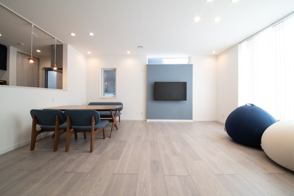 「室内はあまりモノを置かず、すっきりとした空間にしたい」と要望。リビングルームはホワイト系の壁クロスと淡い色合いの木調フローリングで開放的に、ネイビーカラーのアクセントクロスが空間を引き締めています。壁掛け式のテレビは、ブレイン札幌の提案で壁をふかして、配線などが見えないように設置しました。上部には横長のハイサイドライト(高窓)も設けて明るい光を採り入れています。