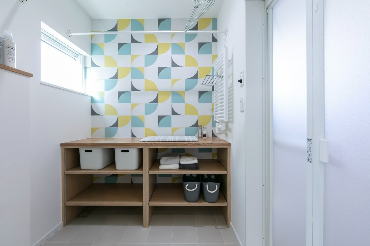 アイロン台にもなる収納棚の付いたランドリールーム。洗う、干す、しまうという作業が完結する家事ラク・ポイントです。北欧風のカラフルな壁紙で明るく爽やかな空間に仕上がりました。